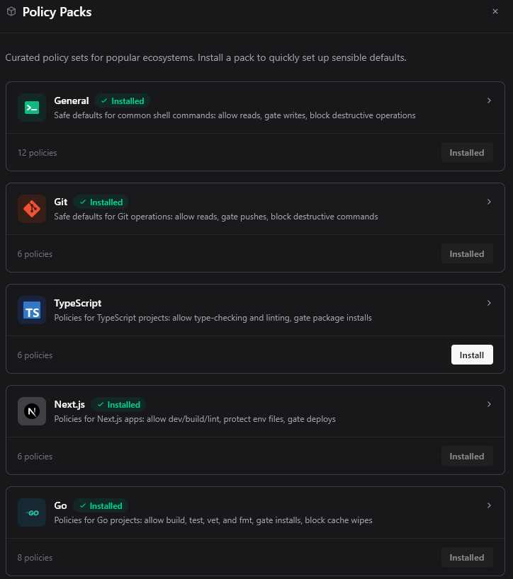 Setting up permissions from scratch is a pain, so we’ve included some policy packs with sensible defaults for popular languages and frameworks to get you started!