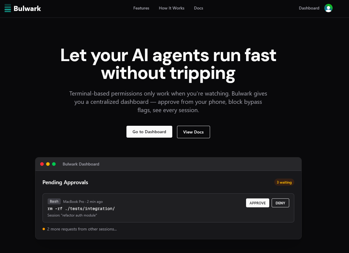 Bulwark is the centralised permission layer for your agents, applying the same policies across different tools and devices. Under the hood, it uses the hook system provided by Claude Code and other tools to send commands to a central server, apply policies and automatically approve or reject them. You can try it now at getbulwark.ai. It’s free!